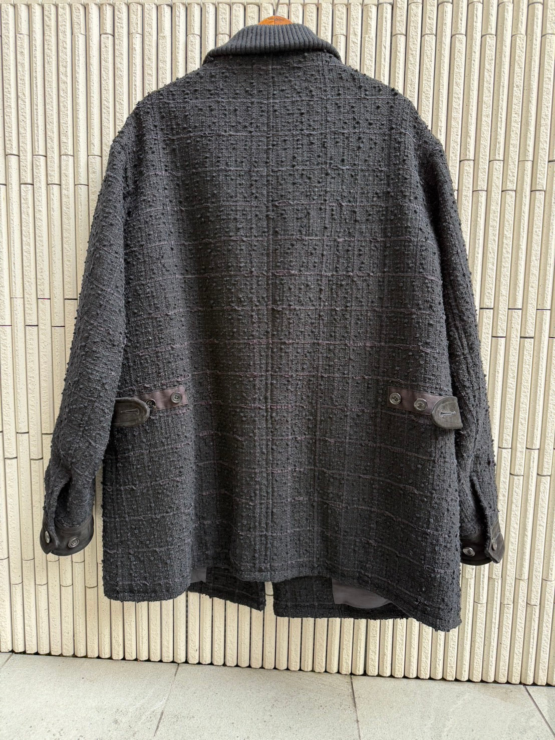 ヴィンテージデザインの通称ファラオジャケットをショートコート丈にアレンジしました。今回のオリジナルツイードはマットな仕上げを目指したのでキャラが強めに出がちなシャネルツイードですが大きな面積のハーフコートデザインに組み合わせました。袖口カフスや胸ポケット口など部分的にカーフヌバックを使用しています。