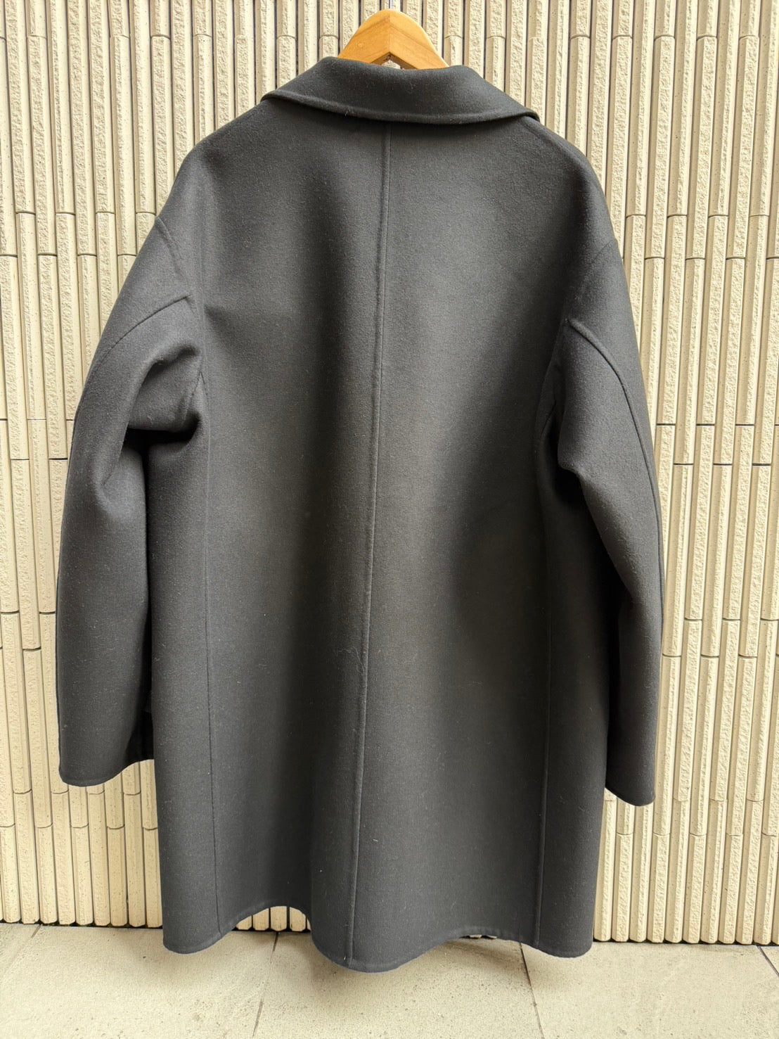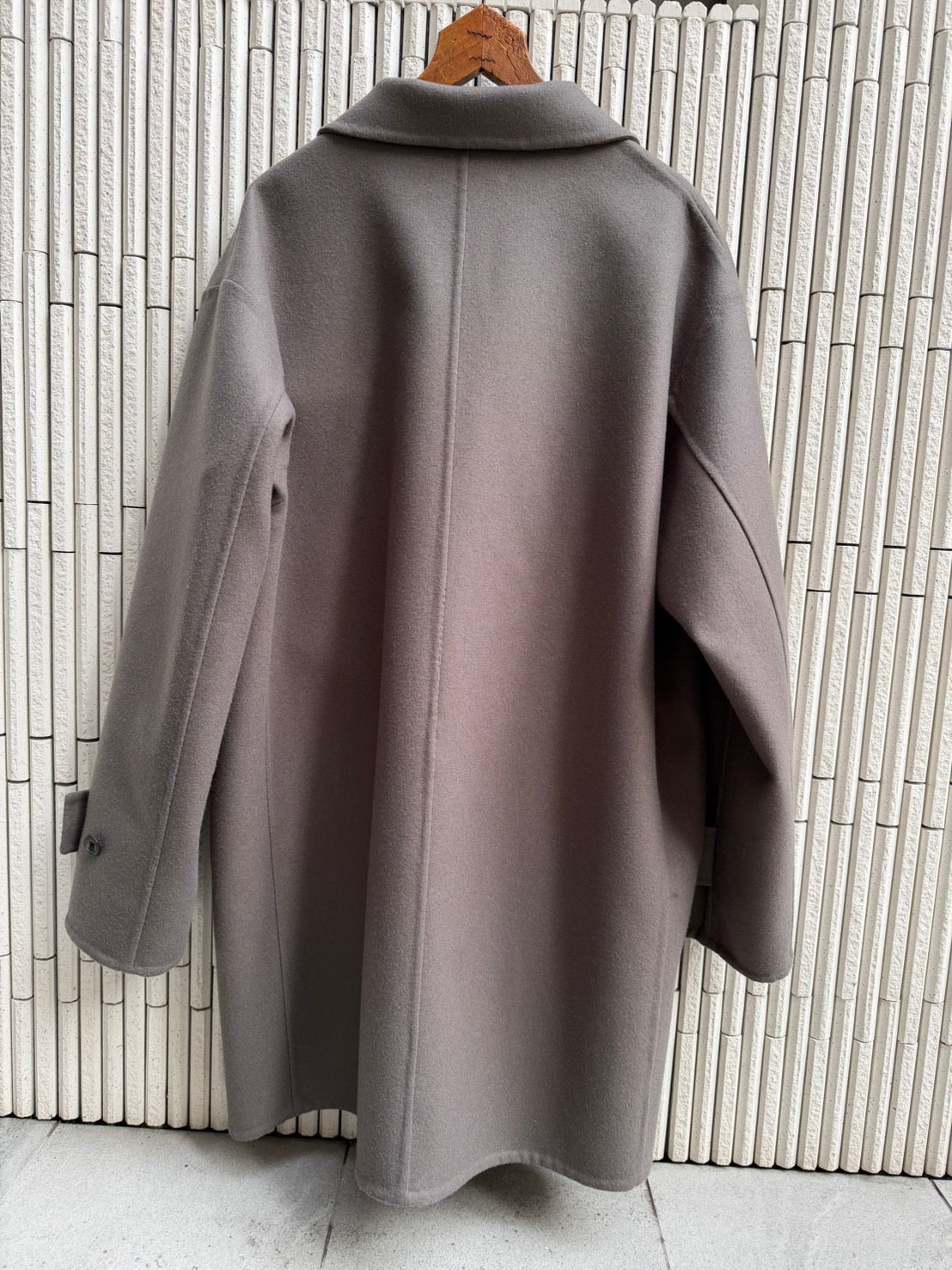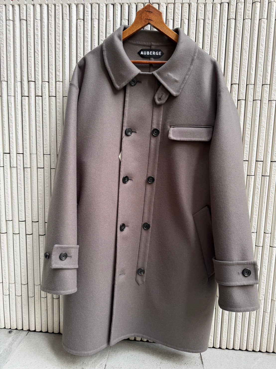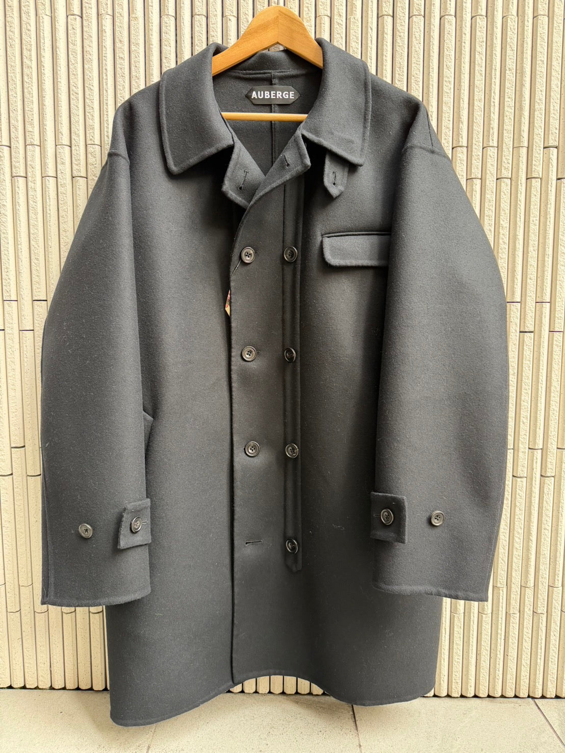 無双(リバー縫製)による、通称コルビジェジャケットをハーフコート丈にアレンジしました。そもそもコルビジェ型はコーグルでオープンカーを乗っていた20世紀初頭のデザインでレザーのロングコートであった。重さが特徴の無骨なコルビジェとナイーブな縫製の未知なるマッチング。