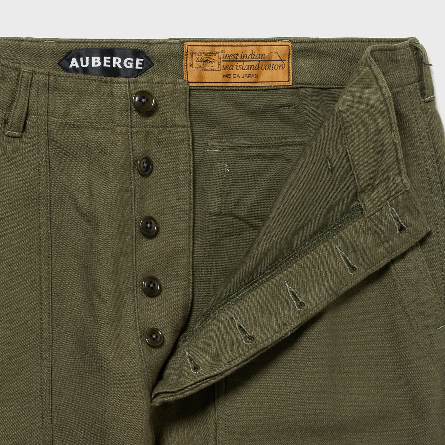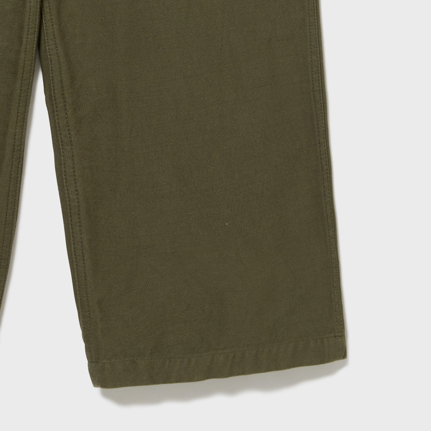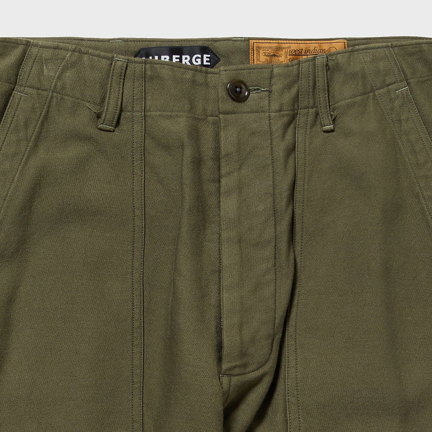 デザイン・・・いわゆる米軍のベイカーパンツは深めの股上から腰回りがノータックでジャストフィットするレディーススラックスを思わせる型紙で腰上部に張り付くようなシルエットが特徴です。これをそのまま写しで作るより、今回は好評を博したM41チノ型原型に50年代製ベイカーパンツのディテールを乗せてみました。バックサテン特有のもっちり感を柔らかなカリブ海島綿の特製が相まって今までにない、履き古したようなとろみが特徴なモードアイテムとも相性の良いワイドストレートパンツが完成いたしました。
