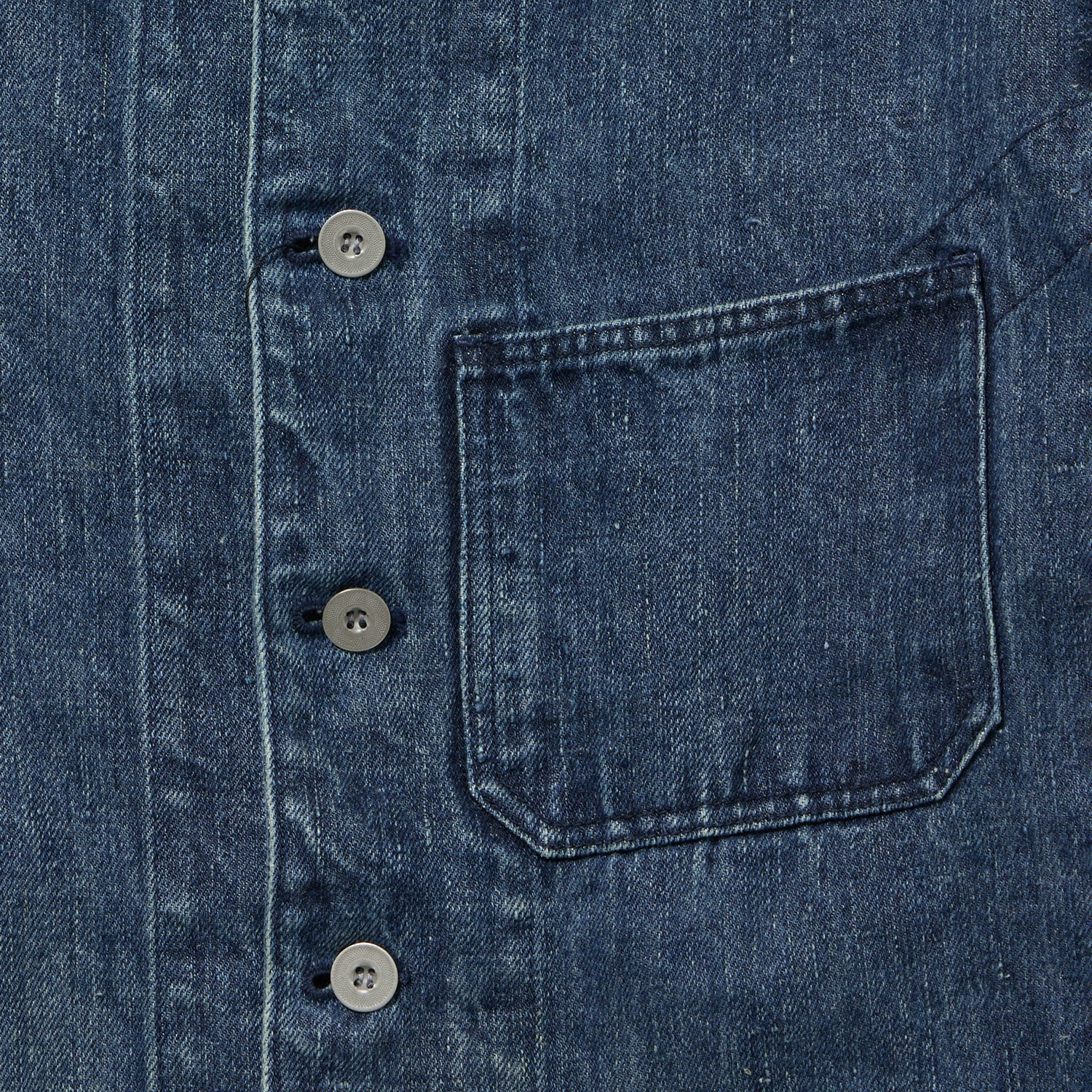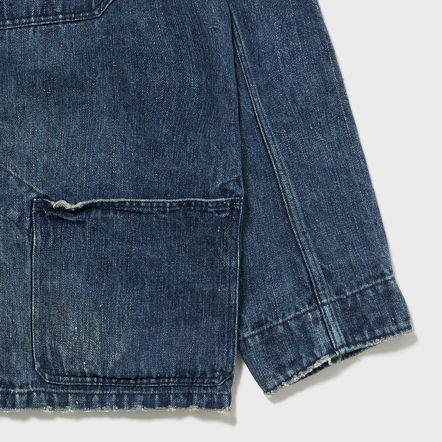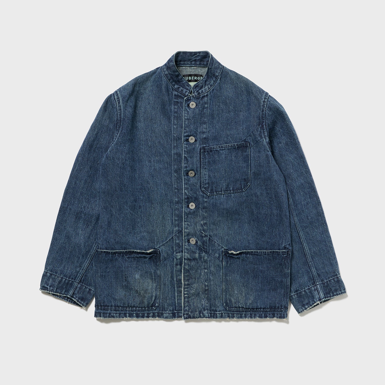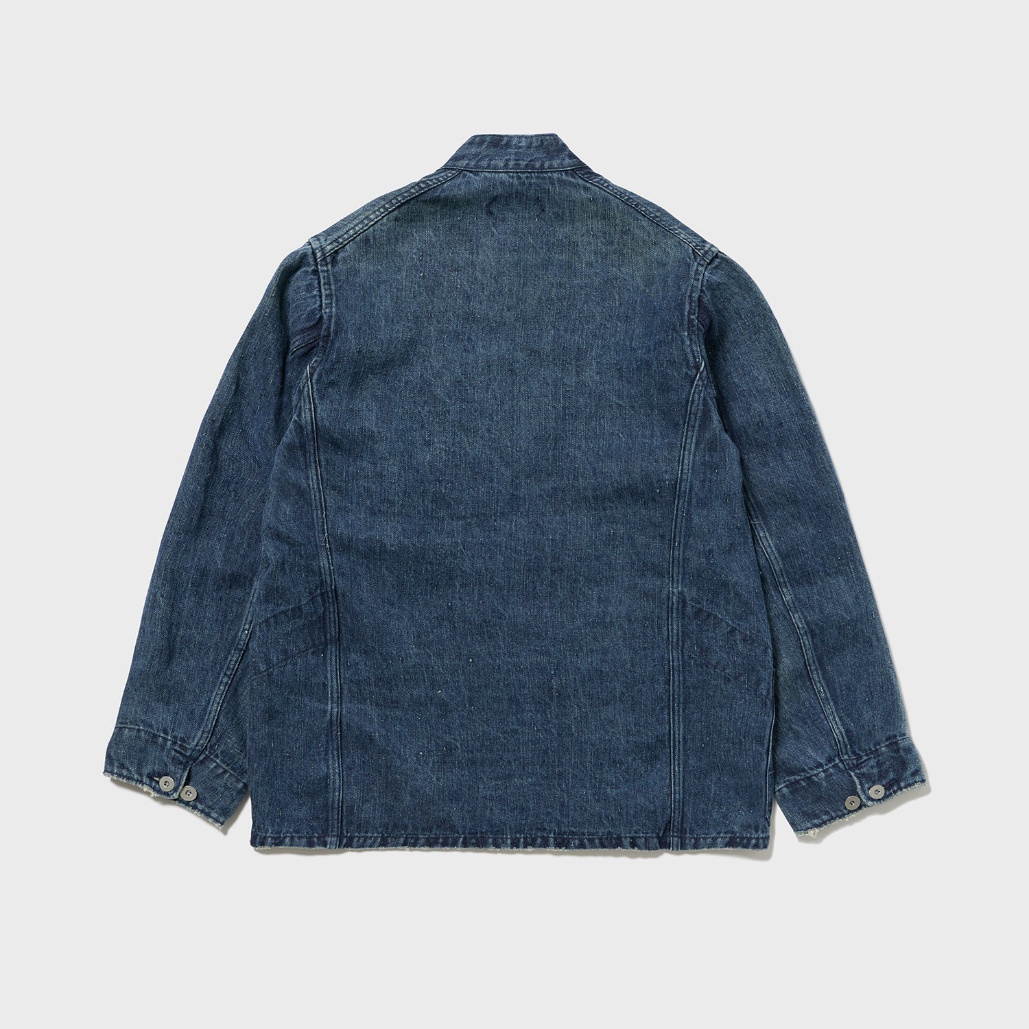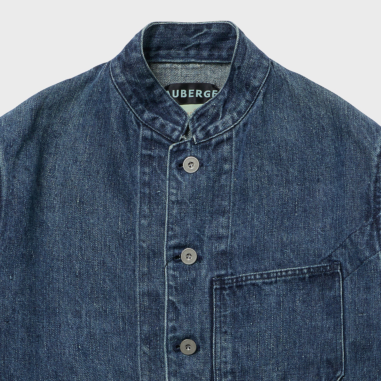 麻原料+インディゴの生地はアメリカにはあまり流通しておらず、フランス、ヨーロッパが19世紀まではメインであったことから、UKワークウエア界の異端児「Fabram」社のスタンドカラーセットアップをイメージ致しました。イギリス独特のワークでありながら前に振る袖もしっかり型紙に反映しております。